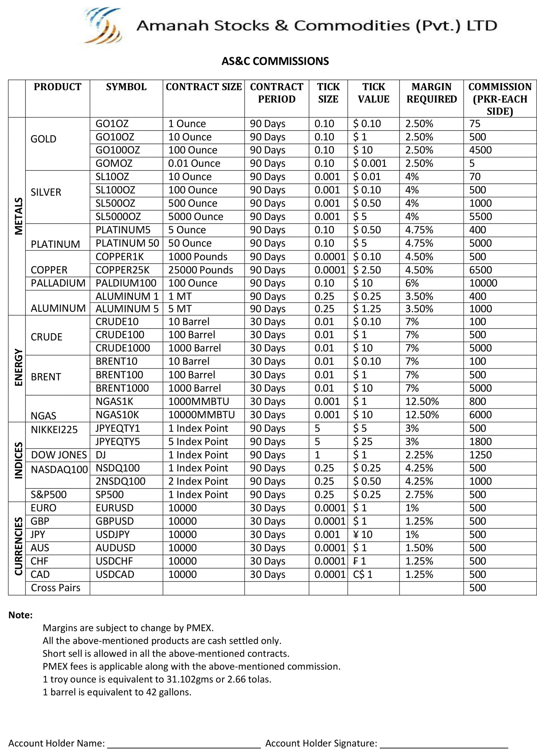 At Amanah Stocks & Commodities (Pvt) Ltd, we offer a transparent and competitive commission model aligned with PMEX product categories. Below is the detailed commission and margin structure across various commodity and financial instruments: